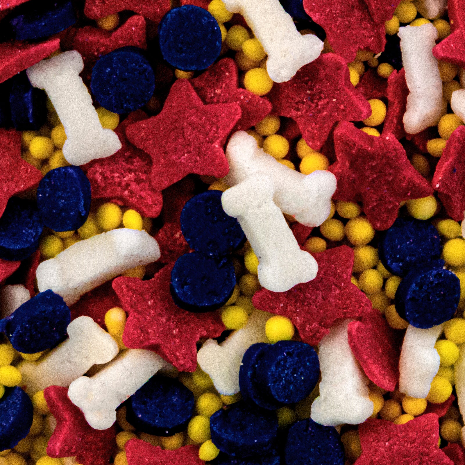What's Inside: Mix of white bones, yellow 100s & 1000s, navy confetti & red stars
