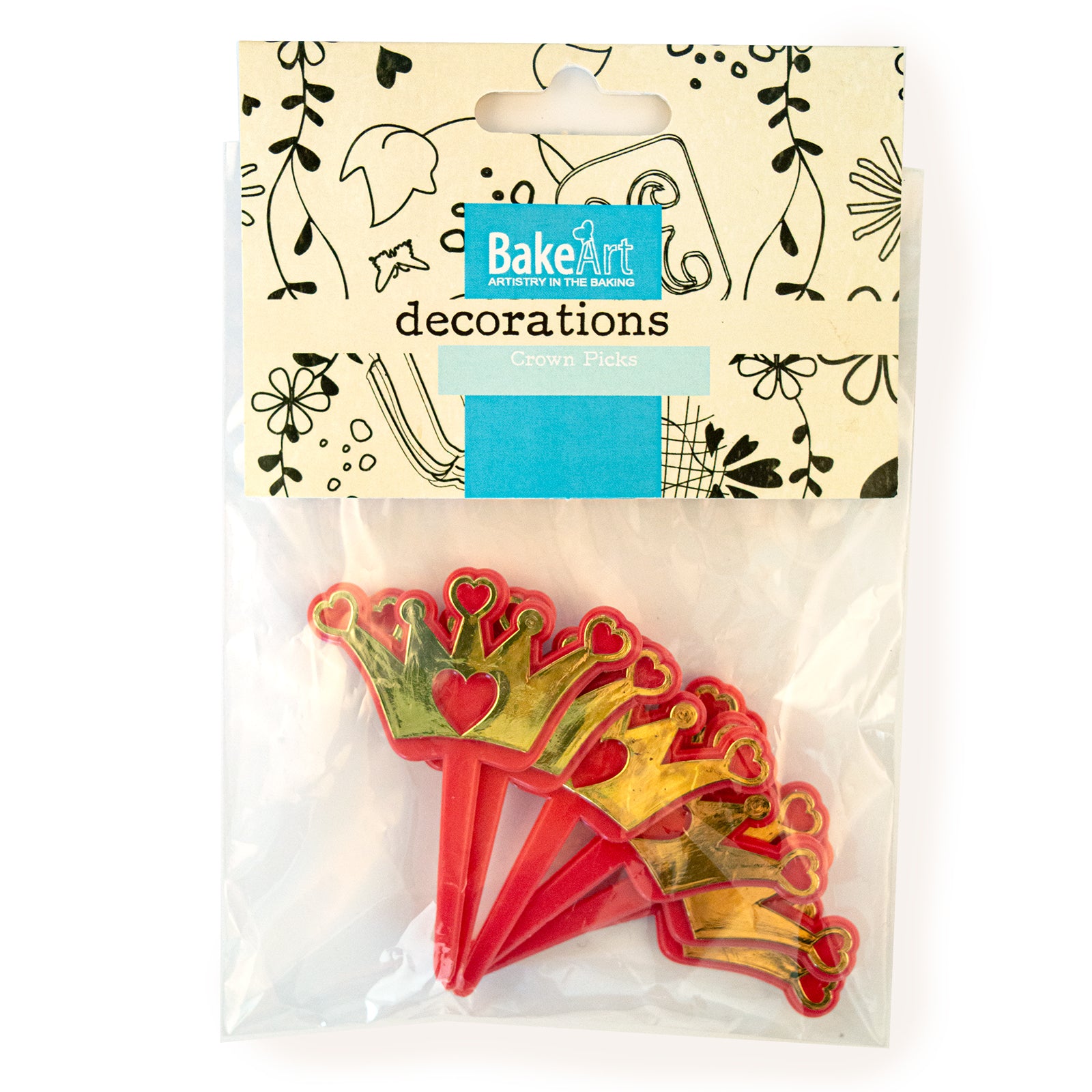 What's Inside: 6 plastic picks - red plastic with gold finish. Can be used on cakes or cupcakes.