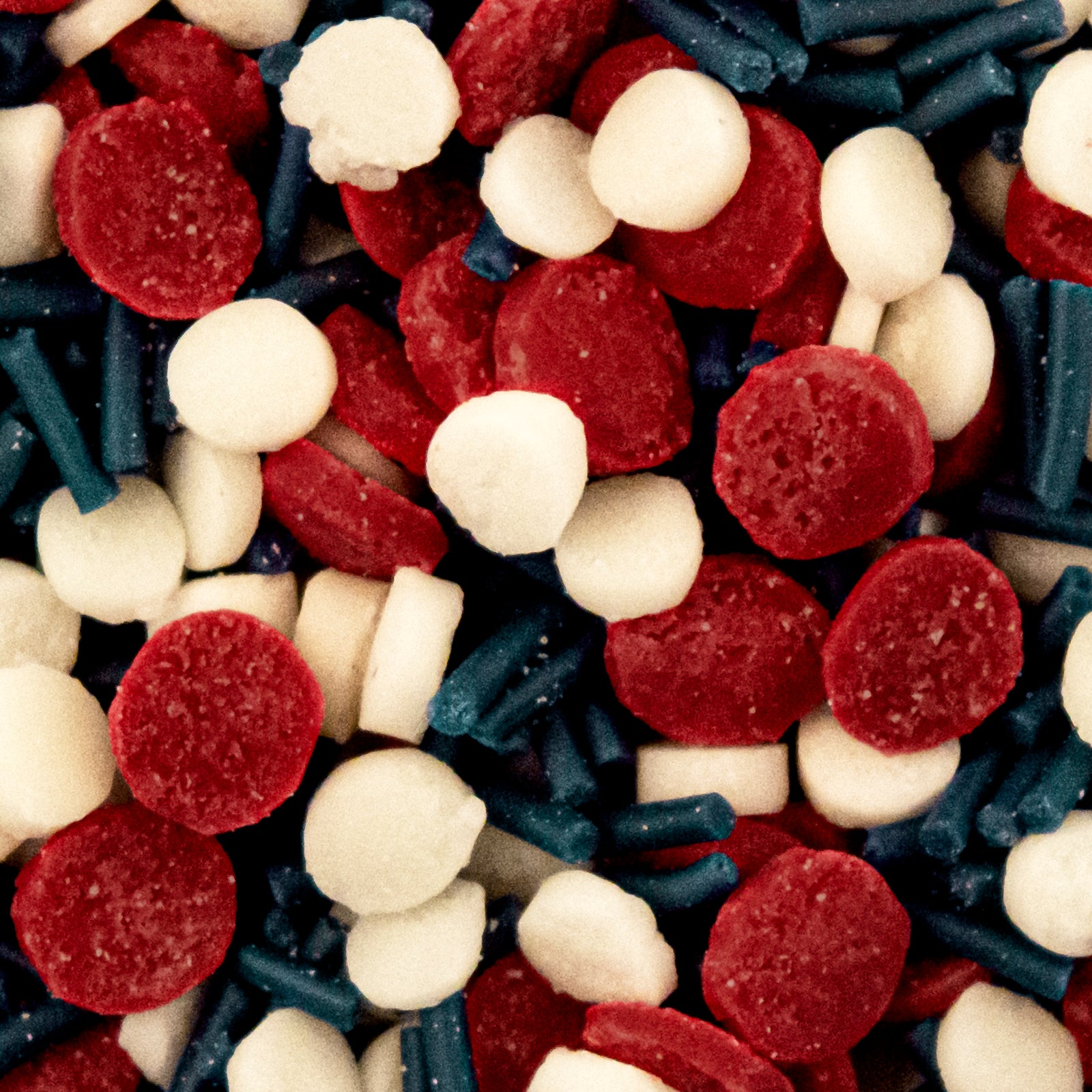 What's Inside: Mix of navy vermicelli, red discs and white confetti sprinkles.