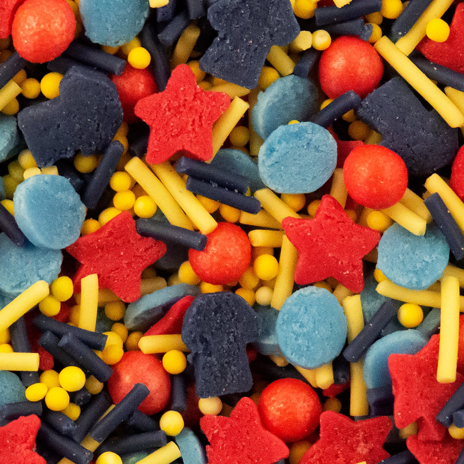 What's inside: navy shirts & strands, yellow strands & 100's & 1000's, blue discs, red stars & balls