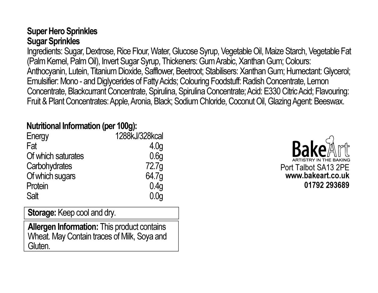 ingredients: Sugar, Dextrose, Rice Flour, Water, Glucose Syrup, Vegetable Oil, Maize starch, Vegetable Fat (Palm Kernel, Palm Oil), Invert Sugar Syrup, Thickeners: Gum Arabic, Xanthan Gum; Colours: Anthocyanin, Lutein, Titanium Dioxide, Safflower, Beetroot; Stabilisers: Xanthan Gum; Humectant: Glycerol; Emulsifier: Mono - and Diglycerides of Fatty Acids; Colouring foodstuff: Radish Concentrate, Lemon Concentrate, Blackcurrant Concentrate, Spirulina , Spirulina Concentrate; Acid: E330 Citric Acid; Flavouring: Fruit & Plant Concentrates: Apple, Aronia, Blackc; Sodium Chloride, Coconut Oil, Glazing agent: Beeswax. Allergen information: This product contains wheat may contain traces of milk, soya & gluten. Not suitable for vegans,